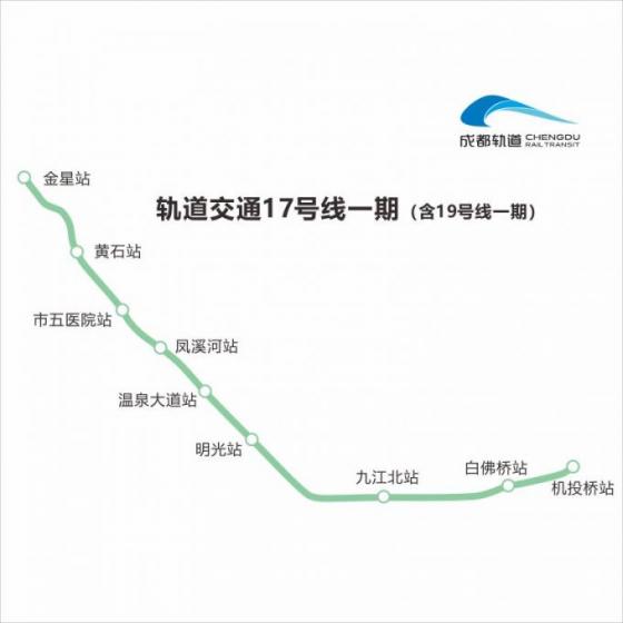 17号线是成都市域快速轨道交通层次中重要的西部快线,通过主支线的方式串联了武侯、双流东升、温江组团,开通后将进一步加强各区域之间的快速联系。17号线一期工程范围为金星站(含)至机投桥站(含);线路主要沿生态大道、凤溪大道、凤翔大道、香榭大道、永康路,自西向东敷设。线路长约26.145公里;共设车站9座,其中高架站2座,地下站7座,停车场1处,车辆段1处。铺轨里程总计99.175公里,正线铺轨67.293公里,永义车辆铺轨19.858公里,五桐庙停车场铺轨12.024公里。