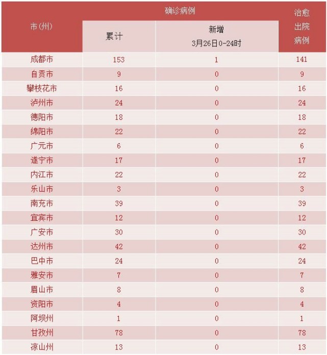 成都热线摘自腾讯·大成网3月26日0-24时,我省新型冠状病毒肺炎新增确诊病例1例(境外输入),无新增治愈出院病例,无新增疑似病例,无新增死亡病例。