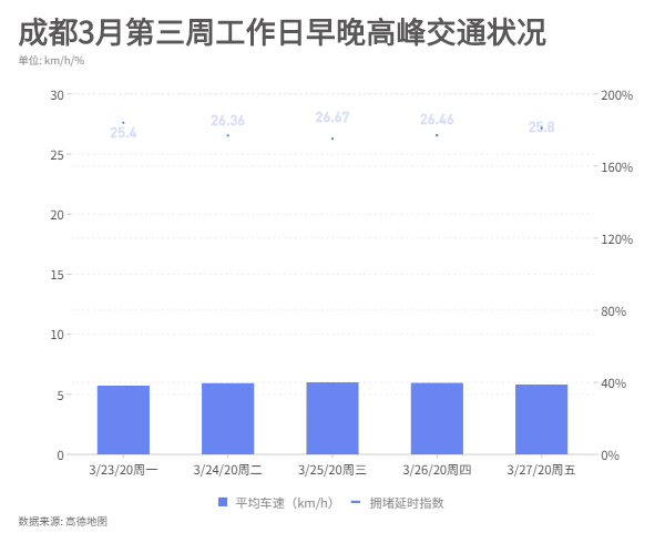 数据显示,3月23日周一这天为上周工作日早晚高峰最堵的一天。拥堵延时指数(实际通行时间与畅通状态通行时间比)高达1.84,全市车辆平均时速仅为25.4km。3月27日周五这天拥堵延时指数为1.81,车辆平均时速为25.8km,排名第二。23日-27日,五个工作日里,早晚高峰的平均车速均为超过30km/h。